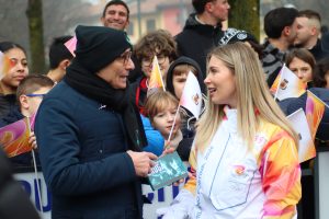 A Drug-Free World volunteer shares The Truth About Drugs booklets with a torchbearer during the 2026 Winter Olympics in Italy, turning a moment of celebration into an opportunity for drug education and prevention.